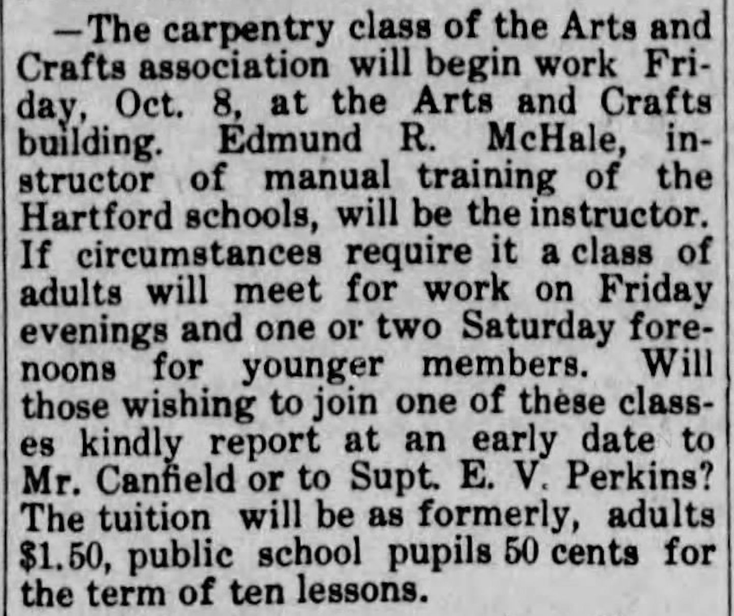 “The Craft Shop is a philanthropy. It was organized to help men and woman add to their limited incomes by the making of useful and beautiful things. The articles are sold on commission and this commission is used to meet the necessary expenses of the shop, such as postage, stationery, wrapping, paper and so on, and then it helps to pay the rent and lighting of the old store, which the Arts and Crafts uses for its headquarters. Thus the Craft shops helps to make possible a place where the classes in carpentry and drawing and such other ones as may be conducted through the winter months, may meet…”
