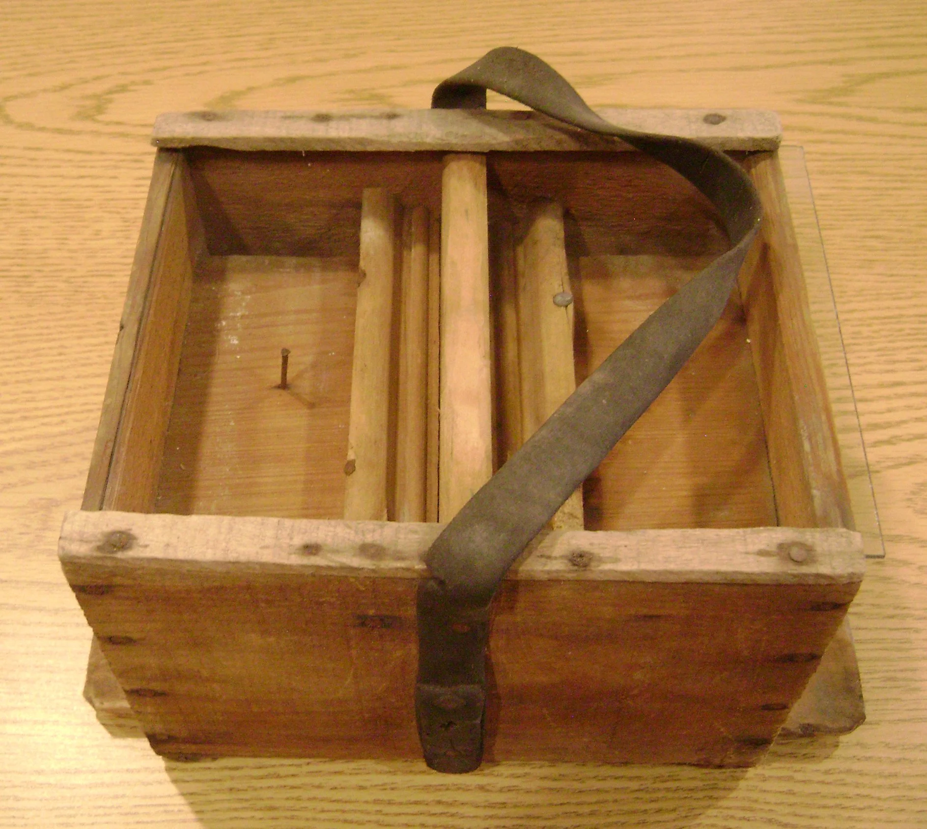 Bee-lining box in the Woodstock History Center’s collection that was donated by Kit Nichols. This bee-lining box has a sliding glass cover, instead of hinged doors on top, to allow the bee hunter to trap and release bees.